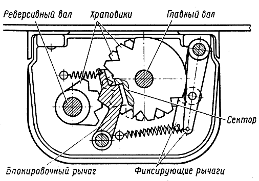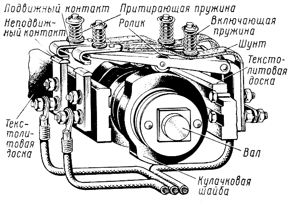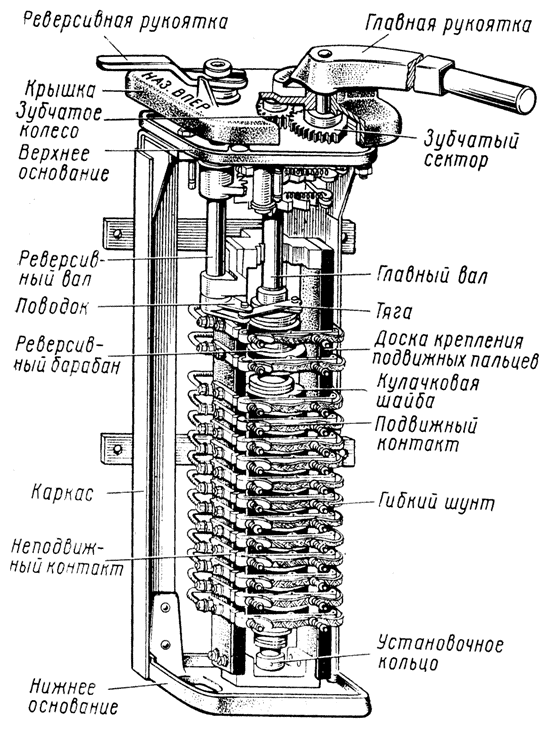 КОНТРОЛЛЕР МАШИНИСТАОсновные функции по управлению тепловозом выполняет непосредственно машинист. Главным устройством, с помощью которого осуществляется управление тепловозом, является контроллер (рис. 195). Используя рукоятки контроллера, машинист приводит в движение тепловоз, увеличивает или уменьшает мощность, развиваемую дизелем, а значит, и скорость движения тепловоза, изменяет направление его движения. Контроллер позволяет преобразовать действия машиниста в электрические сигналы. Эти сигналы по проводам передаются к контакторам, реверсору, реле и другим аппаратам, непосредственно управляющим локомотивом. Рис. 195. Контроллер машиниста Контроллер тепловоза снабжен двумя рукоятками: главной и реверсивной. Реверсивная рукоятка может быть установлена в два крайних положения: «Вперед» и «Назад». При среднем положении реверсивной рукоятки контроллер запирается в выключенном состоянии. Главная рукоятка на тепловозах ТЭЗ имеет 17, на тепловозах 2ТЭ10Л и 2ТЭ10В — 16 фиксированных положений (позиций). Первое положение соответствует холостой работе дизеля, при последующих положениях тепловоз приводится в движение. Главная рукоятка соединена с помощью зубчатого сектора и зубчатого колеса с верхним концом главного вала контроллера. Рукоятка вместе с валом может поворачиваться во втулочных подшипниках, запрессованных в крышку, верхнее и нижнее основания контроллера. Рис. 196. Кулачковый элемент контроллера Параллельно на второй текстолитовой доске шарнирно на осях установлены пальцы с подвижными контактами. Палец своим роликом опирается на боковую поверхность кулачковой шайбы, имеющей один или несколько вырезов. Шайбы, изготовленные из изоляционного материала, укреплены на главном валу контроллера. Когда машинист поворачивает главную рукоятку контроллера, то вместе с валом поворачиваются и шайбы. Наконец, рукоятка поставлена в такое положение, когда ролик подвижного контакта попадает в вырез шайбы. При этом подвижный и неподвижный контакты замыкаются под действием включающей пружины. Они останутся замкнутыми при перемещении главной рукоятки на следующие позиции до тех пор, пока не окончится вырез шайбы. Таким образом, в зависимости от длины вырезов и их количества в шайбе можно осуществлять замыкание контактов на нужных позициях контроллера. Контроллер имеет необходимое число пар подвижных и неподвижных контактов в соответствии с количеством замыкаемых цепей управления. Рис. 197. Схема блокировочного и фиксирующего механизмов рукояток контроллера Он состоит из двух храповиков с вырезами, в которые входят ролики фиксирующих рычагов, и сектора между храповиками. Главная рукоятка устанавливается только в свои фиксированные положения, когда один из роликов входит в вырез храповика. Три положения реверсивной рукоятки фиксируются с помощью аналогичного устройства. Лишь блокировочный рычаг имеет вместо ролика простой выступ, который входит в пазы храповика, укрепленного на реверсивном валу. Этот рычаг одновременно выполняет и функции запирающего устройства контроллера. При среднем (выключенном) положении реверсивной рукоятки выступ рычага входит в неглубокий паз храповика, фиксирующего положение реверсивной рукоятки. Выступ с другой стороны рычага заходит в паз сектора, фиксирующего положение главной руко