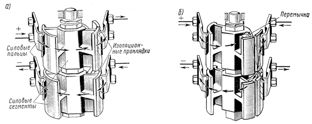 Каждая группа сегментов имеет по два барабана. В свою очередь барабан состоит из двух изолированных Друг от друга частей. Отдельные части сегментов соединены между собой, как показано на рис. 199. В положении реверсора, изображенном на рис. 199, а, ток проходит через плюсовые зажимы реверсора, левые верхние пальцы, барабан реверсора, правые верхние пальцы и далее по кабелю передается в обмотки возбуждения тяговых электродвигателей, откуда возвращается через нижний барабан реверсора: кабель — правые пальцы — барабан — левые пальцы — минусовые зажимы — кабель. Тепловоз движется вперед. Для изменения направления тока в обмотках возбуждения достаточно повернуть вал реверсора (рис. 199, б). При этом левые верхние и нижние пальцы хотя и передвинутся по поверхности барабанов, но останутся на прежних сегментах. Правые же пальцы переместятся через изоляционные прокладки между сегментами. Путь тока будет следующим: от плюсовых зажимов через силовые пальцы и сегмент, далее через перемычку к нижним правым пальцам, по кабелю, через обмотки возбуждения тяговых двигателей, но уже в обратном направлении. Ток возвращается по кабелю к верхним правым пальцам, далее проходит через сегмент верхнего барабана, наклонную перемычку, сегмент нижнего барабана, пальцы, кабель и т. д. Тепловоз движется назад. Ток не может проходить, как в первом случае, от пальцев одного барабана к пальцам того же барабана, так как теперь сегменты, на которые опираются пальцы каждого барабана, разделены изоляционными прокладками. Аналогично устроены и две другие группы парных сегментов. Отдельные группы парных сегментов между собой электрических соединений не имеют.