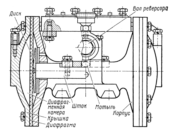 В нижней части реверсора размещен его воздушный привод диафрагменного типа. В отличие от привода группового контактора привод реверсора выполнен с двумя диафрагменными камерами (рис. 200). Подачей сжатого воздуха в полость между диафрагмой и крышкой каждой камеры управляет свой электромагнитный вентиль. При срабатывании вентиля поступающий сжатый воздух давит на диафрагму, диафрагма— на шток. Подвижная система с помощью мотыля, укрепленного на штоке, поворачивает вал реверсора вместе с контактными сегментами в крайнее рабочее положение. При срабатывании второго электромагнитного вентиля (первый вентиль выключен) сжатый воздух поступает в противоположную диафрагменную камеру и заставляет вал реверсора повернуться в другое крайнее рабочее положение. Из первой диафрагменной камеры сжатый воздух уходит в атмосферу через ее электромагнитный вентиль. Включение вентилей осуществляется с помощью реверсивной рукоятки контроллера машиниста.
