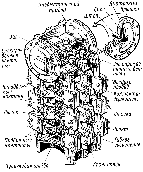 Таким образом, барабанный и кулачковый реверсоры обеспечивают перемену направления вращения якорей тяговых электродвигателей за счет изменения схемы включения обмоток возбуждения двигателей. Однако барабанный реверсор более громоздкий, а на изготовление его контактных барабанов расходуется значительное количество цветного металла. Легко также видеть, что кулачковый реверсор по принципу своего устройства близок к групповому контактору ослабления возбуждения тяговых двигателей. Различие состоит прежде всего в том, что переключение контактов в кулачковом реверсоре осуществляется путем поворота его подвижной системы, а в групповом контакторе — за счет поступательного перемещения подвижной системы в осевом направлении.