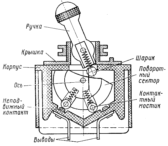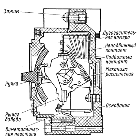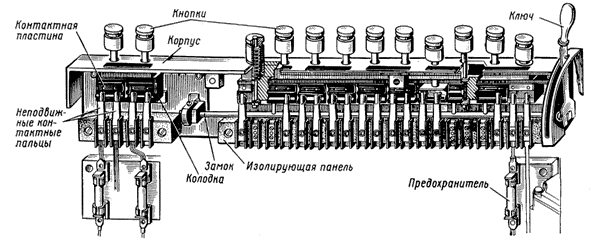 КНОПОЧНЫЙ ВЫКЛЮЧАТЕЛЬ И ТУМБЛЕРЫКнопочный выключатель тепловоза ТЭЗ смонтирован на пульте управления. В нем находится ряд кнопок, с помощью которых машинист производит пуск двигателя тепловоза, включение электродвигателей для привода вспомогательного топливного насоса, маслопрокачивающего насоса, вентилятора калорифера, а также прожектора и ламп освещения приборов (рис. 202). Рис. 202. Кнопочный выключатель Здесь же имеются две контрольные кнопки. Только после их включения электрическая схема приводится в рабочее положение, и тепловоз с помощью контроллера может быть приведен в движение. Напротив каждой кнопки расположены два неподвижных стальных пальца, укрепленных на изолирующей панели. К пальцам подведены провода цепи, замыкаемой кнопкой. Головка кнопки соединена стержнем с фибровой колодкой, имеющей две выемки, в одну из которых заложена медная контактная планка. В выключенном положении кнопка фиксируется свободной выемкой колодки, куда входят концы контактных пальцев. При нажатии на кнопку колодка перемещается, пальцы входят во вторую выемку, и цепь между пальцами замыкается медной пластиной. Две кнопки кнопочного выключателя отличаются от остальных наличием возвратных пружин. Эти кнопки служат для пуска дизелей первой и второй секций тепловоза. Во включенном состоянии они удерживаются рукой только при пуске дизелей, затем возвращаются пружинами в первоначальное положение. Кнопочные выключатели двухсекционных тепловозов имеют механические замки, препятствующие в запертом положении движению фибровых колодок при попытке включить кнопку. Вал замка поворачивается с помощью ключа. После того как кнопочный выключатель закрыт, ключ может быть вынут. В цепи, замыкаемые кнопками, последовательно с ними включены плавкие предохранители для защиты от коротких замыканий (см. рис. 202). Рис. 203. Тумблер Ручное управление тумблером производится с помощью его ручки, которая посредством шарика и пружины устанавливает поворотный сектор в одно из крайних фиксированных положений. Один из контактных мостиков поворотного сектора соединяет два неподвижных контакта (расположенных в плоскости, перпендикулярной представленному на рис. 203 разрезу корпуса тумблера) и замыкает электрическую цепь, которой управляет данный тумблер. При повороте ручки тумблера эти мостиковые контакты разрывают цепь, а вторые мостиковые контакты замыкают другую цепь управления, присоединенную ко второй паре неподвижных контактов. Рис. 204. Автоматический воздушный выключатель Выключатель замыкает управляемую цепь с помощью подвижного и неподвижного контактов. В выключателе ток проходит через биметаллическую пластину (инвар-сталь). В результате нагрева пластина выгибается за счет различных коэффициентов линейного расширения инвара и стали. Если ток превышает допустимый, то, изогнувшись, пластина с помощью механизма расцепления быстро отводит подвижный контакт от неподвижного, предохраняя цепь от чрезмерных нагрузок. Для замыкания цепи после устранения неисправности и остывания биметаллической пластины в течение 1 мин следует взвести механизм расцепления выключателя. Для этого ручку выключателя, соединенную с рычагом взвода, нужно перевести в крайнее нижнее положение, а затем поднять в верхнее положение. Применение автоматических выклю