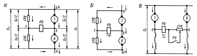 На тепловозе ТЭЗ параллельно двум тяговым электродвигателям каждой группы, соединенным последовательно, включены два одинаковых резистора СРБ (рис. 211, а).