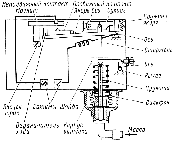 При отсутствии давления масла пружина растягивает сильфон, стержень через сухарь поворачивает якорь, удерживая контакты реле разомкнутыми. По мере повышения давления масла сильфон сжимается, преодолевая нажатие пружины. Стержень поднимает сухарь, который освобождает якорь реле. Пружина поворачивает якорь, и при заданном давлении масла контакты реле замыкаются. Ограничитель хода притягивается постоянным магнитом. Когда давление масла падает, пружина растягивает сильфон, стержень через сухарь поворачивает якорь реле, размыкая контакты.