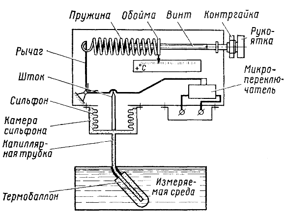 Термореле состоит из двух основных частей: датчика и исполнительного механизма, которые соединены капиллярной трубкой. Датчик представляет собой патрон, заполненный легкокипящей жидкостью. В качестве таких жидкостей используют ацетон, эфир, хлорметил и др. Датчик вводится в трубопровод с жидкостью, температура которой контролируется. По мере повышения температуры жидкости, протекающей по трубопроводу, легкокипящая жидкость в датчике испаряется и повышается давление образовавшегося насыщенного пара. Это давление по капиллярной трубке передается на сильфон исполнительного механизма. Сильфон сжимается, его шток, преодолевая усилие пружин, постепенно поворачивает рычаг реле против направления вращения часовой стрелки. Следовательно, термореле преобразует температуру жидкости в давление насыщенного пара легкокипящей жидкости и далее действует по принципу манометра. Поэтому реле такого типа получили название термоманометрических.