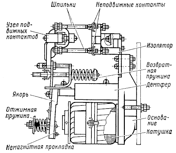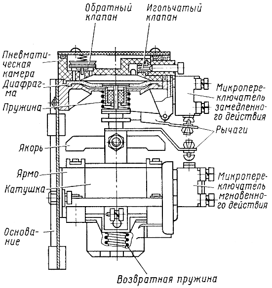 Электромагнитная система реле состоит из катушки, магнитного ярма и якоря. Верхним микропереключателем замедленного действия управляет пневматическая система реле, нижним микропереключателем мгновенного действия — электромагнитная система реле.