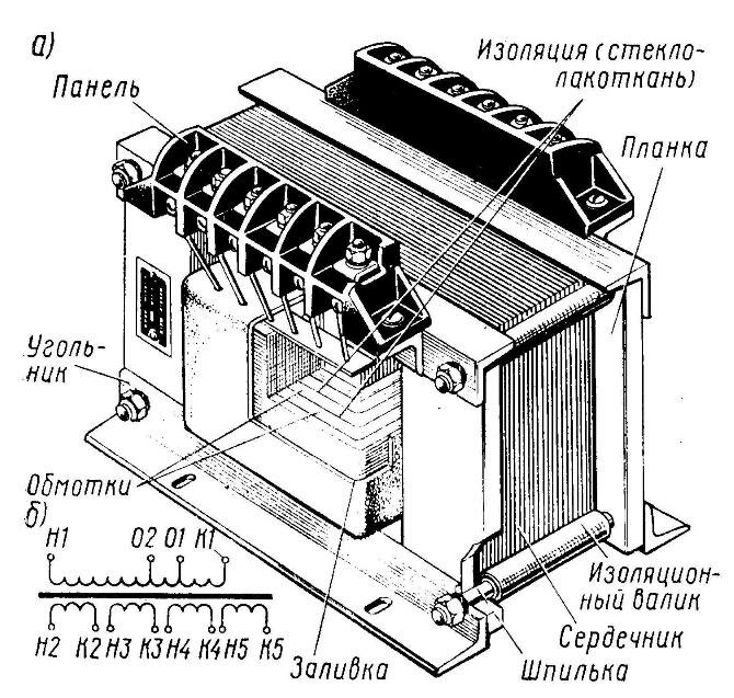 Трансформатор имеет первичную обмотку HI—К1, включающую в себя две автотрансформаторные обмотки О1—К1, О2—К1 и четыре вторичных обмотки Н2—К2, НЗ—КЗ, Н4—К4 и Н5—К5.