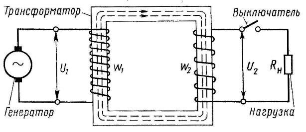 При включении нагрузки во вторичной цепи создается переменный электрический ток I2. Ток, проходя по вторичной обмотке, приводит к некоторому размагничиванию сердечника трансформатора. В результате снижается и э. д. с. самоиндукции в первичной обмотке, увеличивается ток I1 в первичной цепи. Чем ток больше во вторичной цепи, тем сильнее размагничивается сердечник и больше сила тока в первичной цепи.
