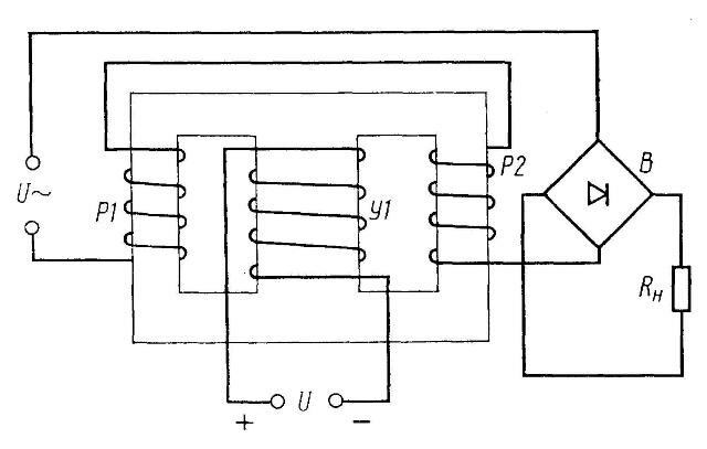 Нагрузка Rн т. е. объект, в котором ток регулируется с помощью магнитного усилителя, включается в цепь рабочих обмоток. Нагрузкой магнитных усилителей часто являются обмотки возбуждения генераторов. Чтобы через нагрузку проходил постоянный, а не переменный ток, в цепь включается выпрямительный мост В.