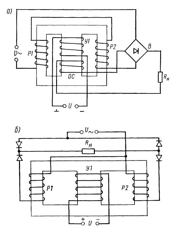 Сердечник изготавливают из электротехнической стали или других ферромагнитных материалов, например из пермаллоя. Катушки Р1 и Р2 рабочей обмотки усилителя включены в цепь переменного тока. В обмотку управления У1 подводится постоянный ток. Рабочая обмотка магнитного усилителя представляет собой индуктивное сопротивление.