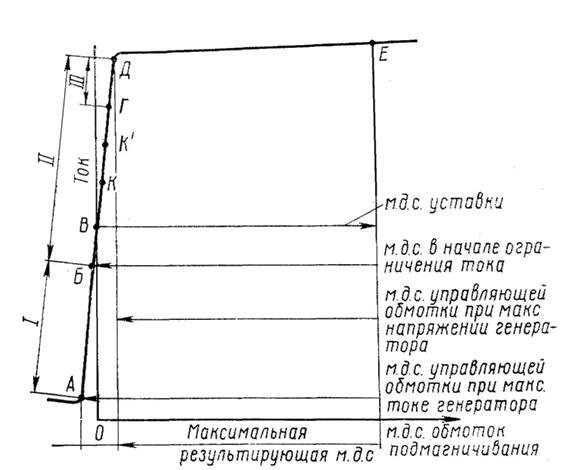 Ток в регулировочной обмотке амплистата изменяется с помощью индуктивного датчика объединенного регулятора частоты вращения и мощности дизеля таким образом, чтобы мощность тягового генератора сохранялась постоянной на гиперболическом участке его внешней характеристики. Следовательно, магнитный поток регулировочной обмотки корректирует суммарное подмагничивание сердечника амплистата, преобразуя линейный участок селективной характеристики тягового генератора и гиперболический.
