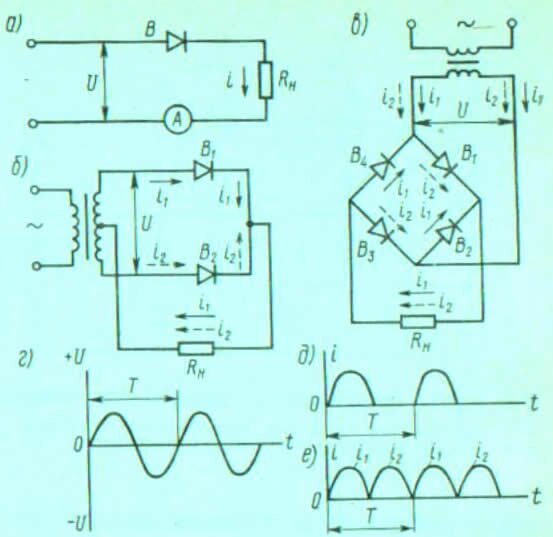 ВЫПРЯМЛЕНИЕ ПЕРЕМЕННОГО ТОКАТеперь познакомимся с работой электрического вентиля в цепях переменного тока. Рассмотрим процесс выпрямления переменного тока при использовании лишь одного вентиля. Вентиль В включается последовательно с нагрузкой Rн, в которой должен быть получен постоянный ток (рис. 233, а). В качестве источника питания используем генератор, вырабатывающий переменный синусоидный ток (рис. 233, г). При положительных значениях напряжения генератора ток I в цепи, а следовательно, и в нагрузке Rн будет изменяться прямо пропорционально этому напряжению (рис. 233, д). В течение отрицательных полупериодов напряжения генератора направление тока в цепи должно измениться на противоположное. Однако вентиль в обратном направлении ток не пропускает. Поэтому при отрицательных значениях напряжения генератора цепь окажется обесточенной. Рис. 233. Выпрямители однофазного тока: а — однополупериодный выпрямитель; б — двухполупериодный выпрямитель с трансформатором; в — двухполупериодный выпрямитель с мостовой схемой включения вентилей; г — график напряжения источника тока; д — график выпрямленного тока в однополупериодной схеме; е — то же, в двухполупериодной схеме В схеме (рис. 234) использовано шесть вентилей, образующих три группы. В каждой группе два вентиля соединяются последовательно. Концы вторичных обмоток трансформатора (или обмоток трехфазного генератора) подключаются к соединенным точкам каждой группы вентилей. Нагрузка соединяется со вторыми зажимами вентилей всех групп. В разбираемой схеме выпрямления каждая фаза вторичной обмотки трансформатора работает в течение одного периода изменения тока дважды. Рис. 234 Выпрямитель трехфазного тока: В качестве примера рассмотрим работу третьей фазы трансформатора. Если обратиться к развернутой диаграмме трехфазного тока (см. рис. 234), то можно видеть, что в момент времени А напряжение первой фазы равно нулю, напряжение второй фазы имеет отрицательную величину, а напряжение третьей фазы положительную. Следовательно, напряжение третьей фазы алгебраически больше напряжения других фаз. Поэтому ток третьей фазы проходит выпрямитель 6, нагрузку Rн, вентиль 3, зажим К2, обмотку второй фазы и возвращается на зажим Н3. При отрицательном же полупериоде напряжения третьей фазы, например в момент времени В, когда напряжение второй фазы равно нулю, а первой — имеет положительное значение, питание нагрузки осуществляется первой фазой. Ток проходит от зажима К1 через вентиль 2, нагрузку Rн, вентиль 5, зажим К3 и обмотку третьей фазы, но уже в противоположном направлении по сравнению с моментом времени А. Пульсации выпрямленного напряжения в рассмотренной схеме получаются весьма небольшими, и ток нагрузки становится почти постоянным по своей величине. В начало статьи |