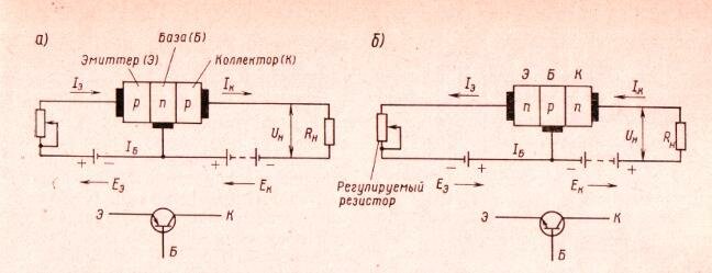а - транзистор типа p-n-p; б - транзистор типа n-p-n