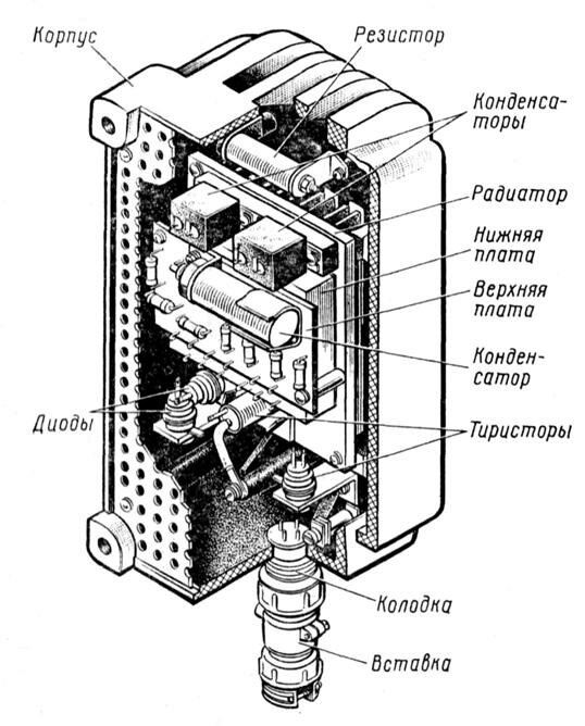 Общий вид полупроводникового регулятора напряжения показан на рис. 239. Регулятор подключается к электрическим цепям тепловоза при помощи штепсельного разъема.