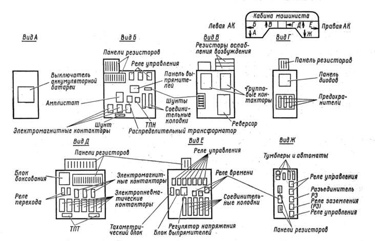 Почти вся электрическая аппаратура сосредоточена в кабине машиниста и в аппаратных камерах.
