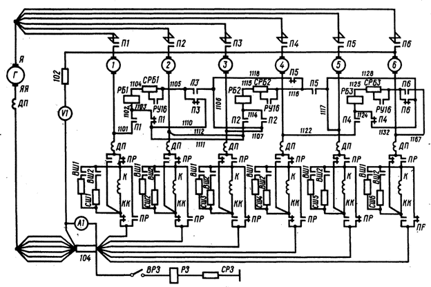 В силовую цепь включены катушки трех реле боксования РБ1—РБЗ и катушка реле заземления РЗ (см. рис. 243). При работе тепловоза, когда замкнуты силовые контакты контакторов П1—П6, их замыкающие блокировочные контакты включают катушку реле боксования РБ1 в цепи первого и третьего тяговых электродвигателей, катушку реле боксования РБ2 —в цепи второго и пятого двигателей, катушку реле боксования РБЗ — в цепи четвертого и шестого двигателей. При отключении неисправного тягового электродвигателя соответствующий электропневматический контактор остается выключенным, а его блокировочные контакты обеспечивают включение катушки реле в цепи другой пары исправных двигателей. Таким образом, и в этом случае все три реле боксования будут использоваться для сохранения противобоксовочных качеств тепловоза. Например, если неисправен и отключен первый тяговый электродвигатель, то замыкающий блокировочный контакт контактора П1 отключает катушку реле РБ1 от цепи первого тягового электродвигателя, а размыкающий блокировочный контакт контактора П1 и замыкающий блокировочный контакт контактора ПЗ включат катушку этого реле в цепи второго и третьего двигателей: провода 1112, 1111, 1103, 1102, катушка РБ1, провод 1104, резистор СРБ1, провода 1105, 1106 и 1107.