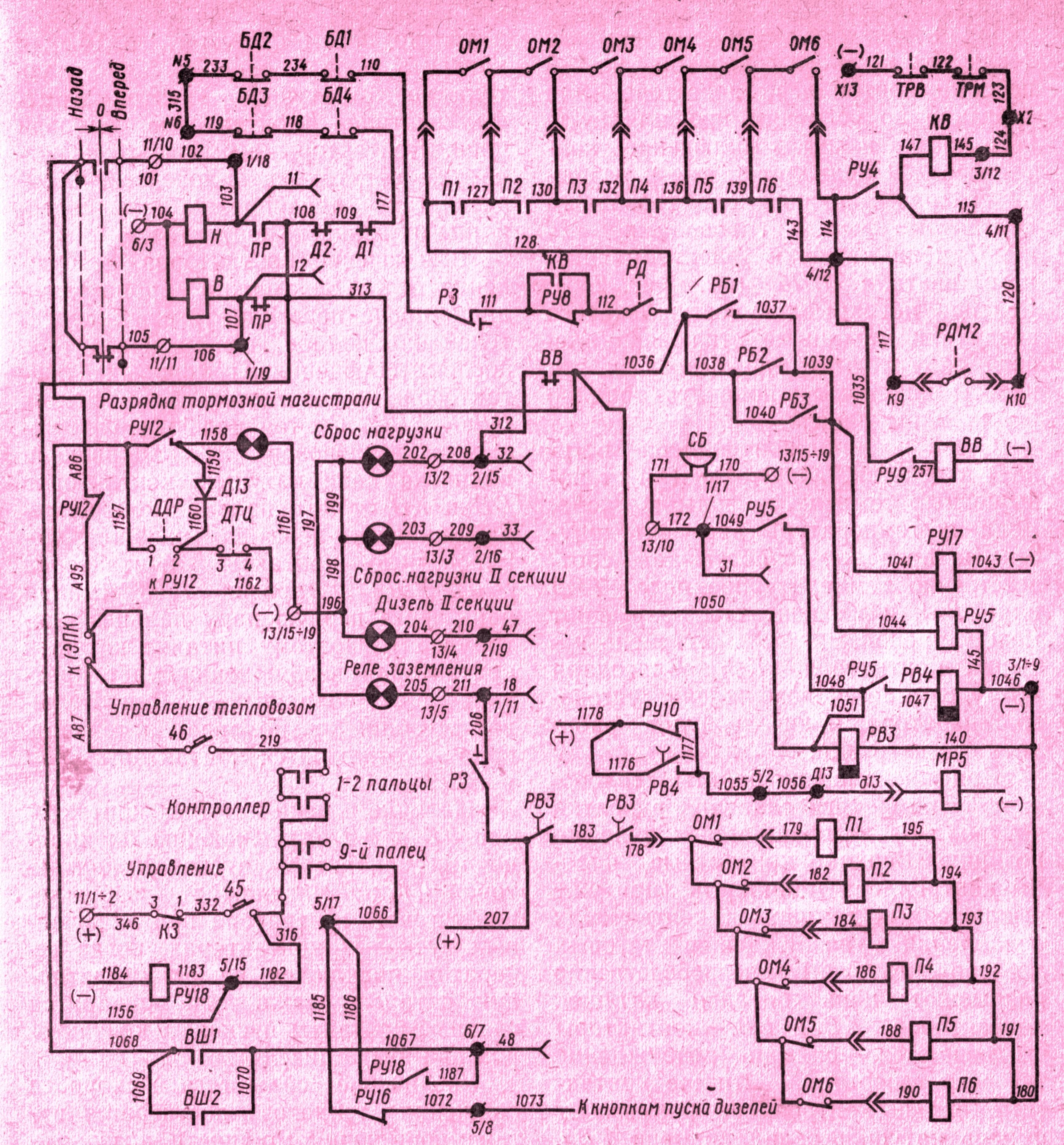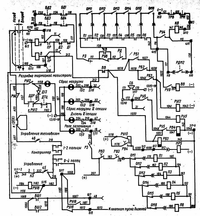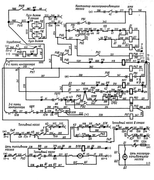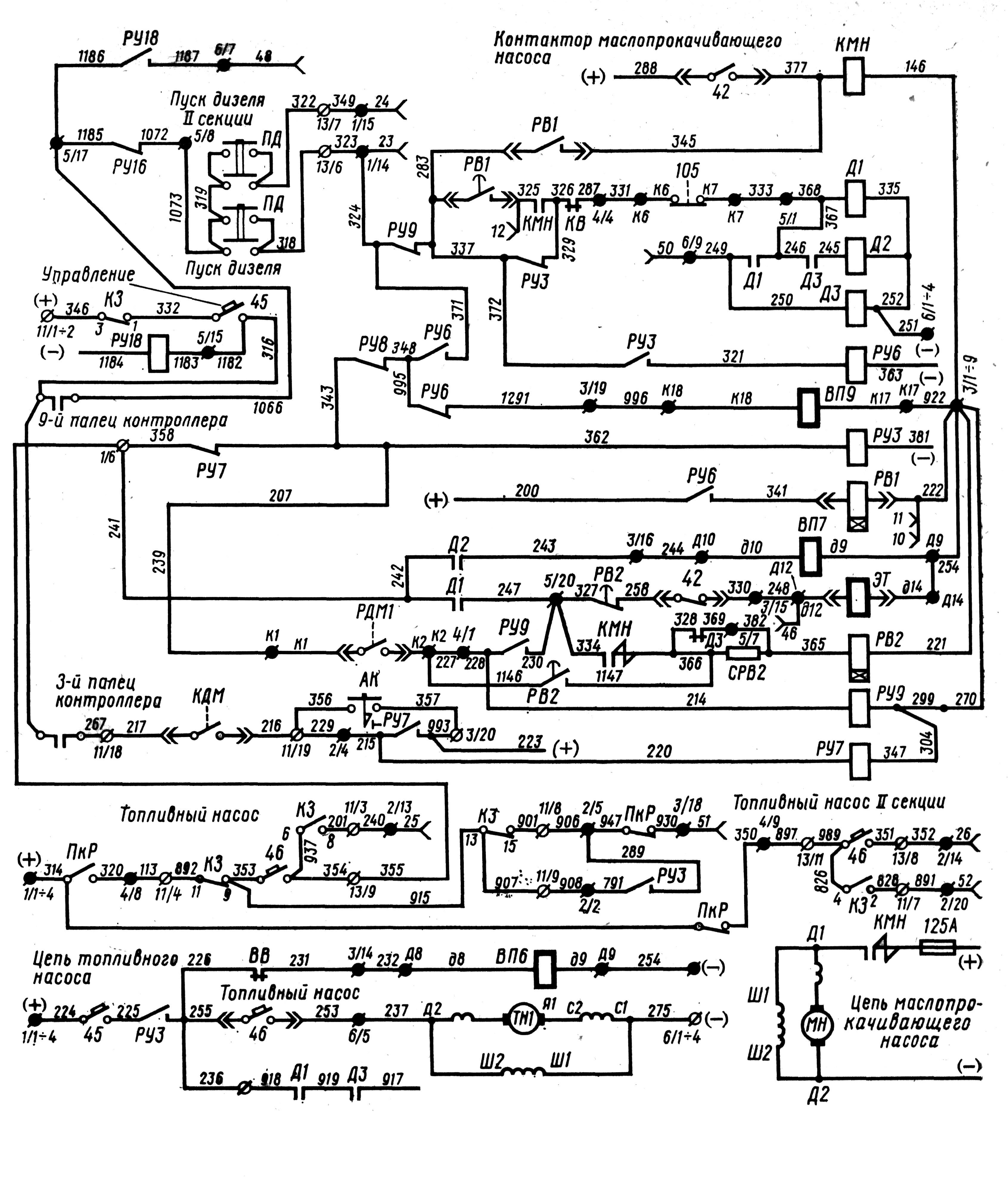 Теперь для пуска дизеля достаточно кратковременно нажать на кнопку ПД «Пуск дизеля». При этом замыкается цепь: плюсовый зажим 11/1—2, контакты 3—1 замкового ключа КЗ, автомат «Управление» 45, провод 316, замкнутый на нулевой позиции 9-й палец контроллера машиниста, провода 1066, 1185, размыкающий контакт реле управления РУ16, кнопка «Пуск дизеля», размыкающий контакт РУ9, провода 337, 372, теперь уже замкнутый контакт реле РУЗ, катушка реле РУ6, минус батареи. Если главная рукоятка контроллера машиниста не будет находиться на нулевой позиции, то 9-е контактные пальцы контроллера окажутся разомкнутыми и пуск дизеля станет невозможным.