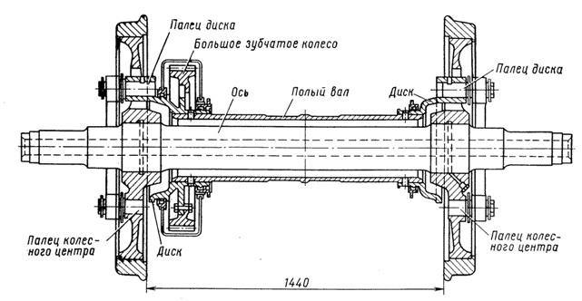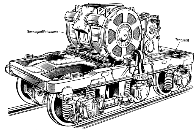 КАК УСТАНОВИТЬ И СОЕДИНИТЬ ТЯГОВЫЙ ЭЛЕКТРОДВИГАТЕЛЬ С КОЛЕСНОЙ ПАРОЙ?Обычно тяговые электродвигатели тепловозов размещают так, чтобы их валы были параллельны осям колесных пар. В этом случае, закрепив на валу электродвигателя малое зубчатое колесо (шестерню), а на оси колесной пары большое зубчатое колесо (см. рис. 248), получают простую зубчатую передачу, посредством которой колесная пара приводится в движение. Рис. 249. Схема опорно-рамной подвески тягового электродвигателя Вы видите, что в колесной паре появилось довольно сложное промежуточное устройство. На участке между колесами ось колесной пары охвачена полым валом (стальной трубой) не вплотную, а с зазором. Полый вал «не падает» на ось, так как удерживается жесткими опорами — двумя моторно-осевыми подшипниками, укрепленными в корпусе тягового электродвигателя. Ведомое (большое) зубчатое колесо насажено на полый вал, который в свою очередь соединен с колесным центром шарнирно-упругими связями: ось колесной пары непосредственного контакта с тяговым электродвигателем не имеет. Вращающий, момент от двигателя передается по следующей цепочке: малое зубчатое колесо — большое зубчатое колесо — полый вал — шарнирно-упругая связь — колесный центр. Рис. 250. Колесная пара тепловозов ТЭП60 и ТЭП70 (первых выпусков) с полым валом Конструктивно шарнирно-упругая связь может быть устроена, например, так. На каждом конце полого вала укрепляют по диску (так называемому приводу) с двумя пальцами, которые, как это видно из рис 251, свободно (с зазором) пропускают через соответствующие отверстия в колесном центре. Еще два пальца укрепляют на самом колесном центре. Рис. 251. Вид на шарнирно-упругую связь колесной пары тепловозов ТЭП60 и ТЭП70 (первых выпусков) На ось колесной пары (с наружных сторон колеса) свободно надевают траверсу («плавающую» рамку), которую четырьмя тягами соединяют с четырьмя пальцами. Тяги, иногда называемые поводками, соединяются с пальцами и плавающей траверсой через резинометаллические втулки, выполняющие роль эластичных шарниров. В целом конструкция представляет собой эластичную муфту. Каждая колесная пара имеет две муфты (на левом и правом колесах). Таким довольно сложным путем с помощью шарнирно-упругих деталей достигается передача вращающего момента колесной паре с полым валом. Эластичные элементы, наличие зазоров, повороты тяг и траверсы — все это и создает условия для взаимного перемещения тягового электродвигателя относительно оси колесной пары при ее движении по неровностям пути и при «игре» рессорного подвешивания. Благодаря этому вращающий момент от тягового электродвигателя колесной паре передается относительно мягко, без ударов. Опорно-рамная подвеска имеет и другие достоинства, связанные с повышением надежности тягового двигателя. Она пробивает дорогу и на грузовые локомотивы, отличающиеся повышенной мощностью и нагрузкой от оси на рельсы. В частности, она применена на новом тепловозе 2ТЭ121 мощностью 2940 кВт (4000 л. с.) в секции. Однако на всех построенных в нашей стране грузовых тепловозах, имеющих относительно невысокие скорости и ограниченную до 225 кН (23 тс) нагрузку от оси на рельсы, опорно-рамная подвеска не применяется, так как конструктивно она сложна, а в обслуживании и ремонте затруднительна. Конструкторы работают над созданием новых, более 