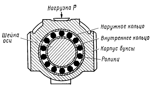 На шейку оси колесной пары насажено внутреннее кольцо, которое вращается вместе с осью. Другое кольцо (наружное) большего диаметра остается неподвижным в корпусе буксы. Между двумя кольцами находятся ролики. Когда тепловоз начинает двигаться, внутреннее кольцо вращается и увлекает ролики, которые перекатываются между кольцами, по своим дорожкам. Обычно на наших локомотивах в одном корпусе буксы размещены два роликовых подшипника, между которыми установлены большое и малое кольца, называемые дистанционными.