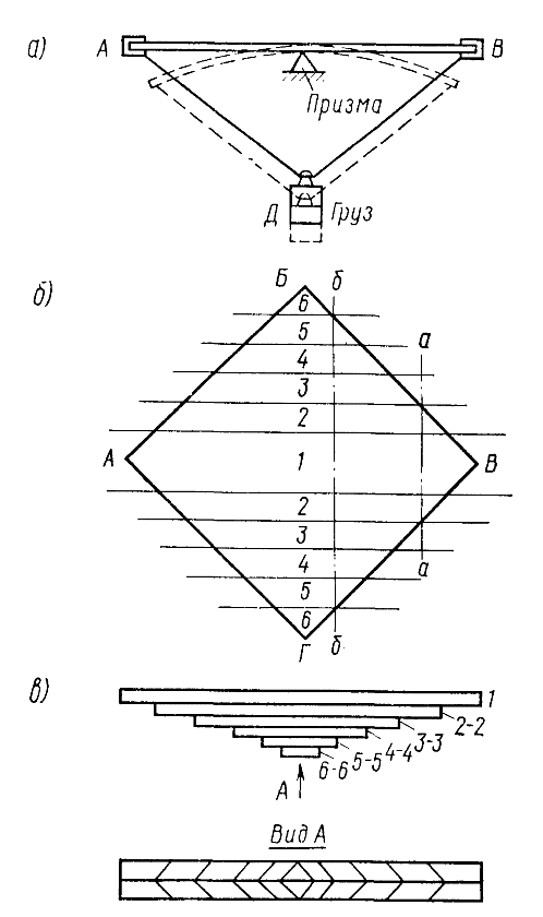 Пластинке необходимо придать форму ромба АБВГ (рис.255, б). Если опереть ромбообразную пластинку посередине на призму и подвесить по концам груз, то в любом ее сечении аа, бб и т. д. будут одинаковые напряжения, так как при такой форме, как это нетрудно догадаться, площадь поперечного сечения, а следовательно, и момент сопротивления пластинки (в направлении от ее концов к середине) будет возрастать пропорционально изгибающему моменту. Такие пластинки в форме ромбов относят к телам, которые носят название тел равного сопротивления изгибу. При ромбообразной форме все листы рессоры при изгибе имели бы примерно одинаковые напряжения. Но ромбообразные листы неудобно применять в подвижном составе из-за слишком большой ширины. Чтобы ширина рессоры была небольшой и в то же время сохранились качества тела равного сопротивления, поступают так: ромбообразный лист разрезают на несколько листов небольшой ширины (линии разреза приведены на рис. 255, б). Затем полученные листы соединяют попарно (в нашем примере 2—2, 3—3, 4—4, 5—5 и 6—6) и накладывают друг на друга (рис. 255, в) с таким расчетом, чтобы наверху был самый длинный и широкий (коренной) лист / (практически берут два-три коренных листа). Под коренным листом размещаются остальные более короткие листы. Количество листов в рессоре выбирается в зависимости от их размеров и величины нагрузки. Собранные таким образом листы охватывают хомутом в средней их части.