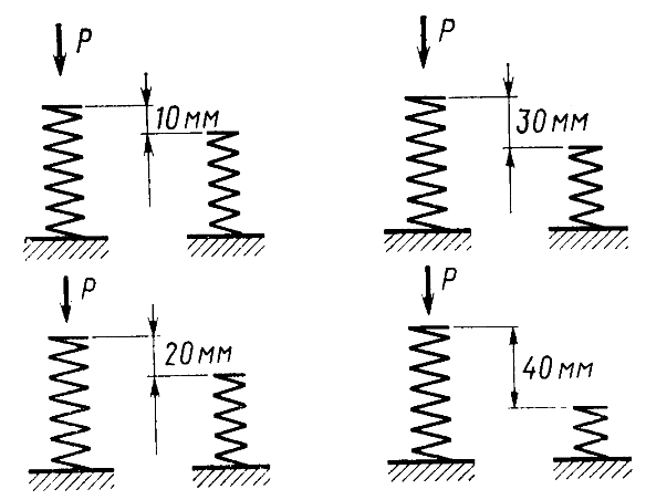 Необходимо, чтобы рессорная система была как можно мягче, т. е. чтобы, по возможности, больше прогибалась (сжималась). Как же определить, какая из рессор или пружин мягче? Возьмем ряд пружин и будем нагружать их одной и той же силой Р (рис. 256).