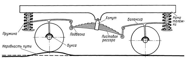Чтобы более равномерно распределить нагрузку между осями тележки, отдельные рессоры часто соединяют одну с другой посредством балансиров. Балансир напоминает коромысло: средней своей частью он опирается на специальную опору буксы, на которой может качаться. С листовыми рессорами балансиры соединены с помощью подвесок. Внешние концы .крайних балансиров через стойку связаны с двойными пружинами, опирающимися на раму тележки. Таким образом, на этот конец балансира нагрузка от рамы передается через две пружины, что позволяет снизить напряженность их работы. На рессоры нагрузка от рамы тележки передается через хомуты, соприкасающиеся с нижней плоскостью боковин тележки посредством подкладок. Механизм, составленный из рессор, балансиров, подвесок, поводков, шарнирных соединений, гасителей колебаний, условились называть рессорным подвешиванием. Оно призвано равномерно распределять (выравнивать) нагрузку между отдельными колесными парами, т. е. снижать динамическое воздействие на путь.