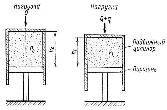 Подвижной цилиндр с поршнем, наполненный сжатым воздухом давлением ро — это же простейшая пневматическая рессора. Как и обычная металлическая, эта рессора в зависимости от величины нагрузки будет сжиматься или распрямляться, т. е. каждому изменению нагрузки (Q + q) соответствует определенное положение цилиндра (высота h1 давление р1). Иными словами, под действием нагрузки, приходящейся на пневморессору (в нашем примере на цилиндр), воздух, заключенный в ограниченном пространстве, будет то сжиматься (рессора становится жестче), то расширяться (рессора становится мягче). Но такая простая по устройству пневморессора имеет упругость меньшую, чем обычная металлическая рессора, и поэтому применение ее нецелесообразно.