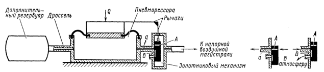 Для питания пневморессор сжатым воздухом они подключаются к напорной воздушной магистрали локомотива. При увеличении нагрузки Q кузова, т. е. при сжатии пневморессоры, в баллон дополнительно впускается сжатый воздух, а при ее распрямлении — выпускается. Благодаря изменению давления внутри пневматической рессоры высота ее под статической нагрузкой локомотива, передающейся от веса подрессоренных частей, поддерживается практически постоянной. Механизм, предназначенный для компенсации утечек воздуха, должен срабатывать только при значительном статическом прогибе рессор (например, при проходе стыков рельсов, стрелочных переводов), а при обычных (небольших) колебаниях тепловоза он срабатывать не должен. Такие быстро протекающие колебания кузова и рамы должны поглощаться резиновыми элементами, которые для этого последовательно включаются в рычажный привод высоторегулирующего механизма. Стоит же вертикальным колебаниям превысить допускаемую величину (амплитуду), на которую рассчитаны резиновые элементы, как в действие вступает уже сам высоторегулирующий механизм, автоматически открывающий или закрывающий доступ воздуха в рессору.