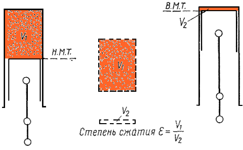 Предположим, что при нахождении поршня в н. м. т. воздух в цилиндре займет объем V1, равный 28,3 л (рис. 17), а при достижении поршнем в. м. т. объем сократится до 2,3 л (объем V2). Это значит, что при сжатии объем воздуха уменьшился в 12,3 раза. В таких случаях говорят, что двигатель имеет степень сжатия, равную 12,3. Объем V2 называют объемом камеры сжатия. Объем V1, состоящий из рабочего объема и объема камеры сжатия, есть полный объем цилиндра.