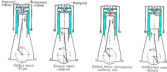 Проследив за процессами, происходящими в цилиндре работающего дизеля, можно заметить, что работа поршня слагается из чередующихся процессов: 1) впуск воздуха; 2) сжатие воздуха; 3) горение впрыснутого топлива, образование газообразных продуктов горения и их расширение; 4) выпуск отработавших газов. Комплекс последовательных процессов, периодически повторяющихся в каждом рабочем цилиндре, называется рабочим циклом двигателя.
