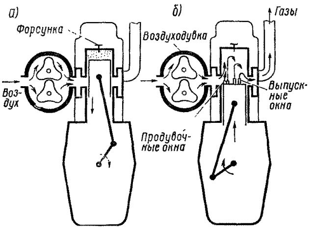 Двухтактный дизель. Изучая процессы, происходящие в работающем дизеле, конструкторы пришли к выводу, что рабочий цикл дизеля можно осуществить и за два хода поршня: при воспламенении и сгорании топлива поршень совершает один ход сверху вниз (рис. 20, а), следующий, обратный ход поршня используется для сжатия новой порции воздуха (рис. 20, б). Для остальных двух процессов отводится гораздо меньше времени, чем раньше: очистка цилиндра и заполнение его воздухом происходят в период, когда поршень находится вблизи н. м. т.