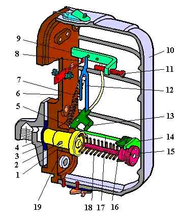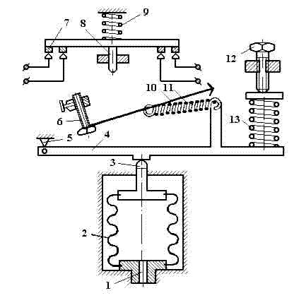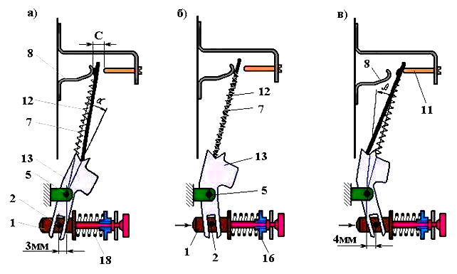 Рис. 3.16 а - Регулятор давления АК-1Б 1- шток, 2- подвижная ось, 3- резиновая диафрагма, 4- фланец, 5- неподвижная ось, 6- основание (плита), 7, 18- пружины, 8- неподвижный контакт, 9- кронштейн, 10- кожух, 11, 15- винты, 12- подвижный контакт, 13- рычаг, 14, 16 -планки, 17- стойка, 19- направляющая На электровозах регулятор давления регулируется на выключение электродвигателя компрессора при давлении в ГР 9,0 кгс/см2 и на включение при давлении в ГР 7,5 кгс/см2, а на электропоездах соответственно на 8,0 кгс/см2 и 6,5 кгс/см2. При отсутствии давления в ГР детали регулятора занимают положение, изображенное на рис. 3.16 б. Под усилием регулировочной пружины 18 шток 1 находится в крайнем левом (по рисунку) положении, а пружина 7 расположенная под углом α = 9° к неподвижной оси 5 рычага 13, надежно прижимает подвижный контакт 12 к неподвижному контакту 8, то есть цепь питания электродвигателя компрессора замкнута. При повышении давления в ГР шток 1 вместе с подвижной осью 2 начинает перемещаться вправо, а рычаг 13 поворачивается вокруг неподвижной оси 5. При таком перемещении угол α начинает уменьшаться, и как только он станет равен нулю, то есть при совпадении оси пружины 7 с осью подвижного контакта 12, система займет неустойчивое положение (рис. 3.16. б). При дальнейшем незначительном перемещении штока 1 пружина 7 резко перебросит подвижный контакт 12 с неподвижного контакта 8 на винт 11 (рис. 3.16. в), то есть произойдет разрыв электрической цепи электродвигателя компрессора. Давление выключения компрессора (размыкания контактов регулятора давления) регулируют винтом 15 за счет изменения затяжки пружины 18, воздействующей на шток 1.Чем больше усилие пружины 18, тем при большем давлении в ГР произойдет размыкание контактов регулятора. Один оборот винта 15 изменяет давление приблизительно на 0,4 кгс/см2. Рис. 3.16 б - Работа регулятора давления АК-1Б Давление включения компрессора, точнее перепад давлений включения и выключения компрессора, зависит от величины раствора контактов «С», который может изменяться винтом 11. Чем меньше раствор контактов, тем при большем давлении в ГР включается компрессор. Так при С=5 мм разница давлений включения и выключения составит около 1,4 кгс/см2, при С=15 мм - 1,8 -2,0 кгс/см2 Регулятор давления ТSР-2В (ТSР -11)Регулятор давления ТSР-2В применяется на пассажирских электровозах ЧС чешского производства. Принцип действия регулятора аналогичен работе регулятора АК-11Б. Сжатый воздух из ГР через штуцер 1 попадает внутрь сильфона 2 (рис. 3.17.), который через упор 3 воздействует на рычаг 4. Рычаг 4 имеет неподвижную опору 5 и нагружен пружиной 13 с регулировочным винтом 12. Рис. 3-17 - регулятор давления TSP-2B При давлении в ГР 9 кгс/см2 пружина 13 сжимается, вследствие чего рычаг 4 поворачивается относительно опоры 5 (по рисунку - против часовой стрелки) и пружина 11 перебрасывает пластину 10 в верхнее положение. Пластина 10 воздействует на толкатель 8 и размыкает две пары контактов 7, в результате чего электрическая цепь электродвигателя компрессора разрывается и компрессор выключается. Когда давление в ГР понизится до 7,5 кгс/см2, пружина 13 повернет рычаг 4 (по рисунку - по часовой стрелке) и сожмет сильфон 2, в результате чего пружина 11 перебросит пластину 10 в нижнее положение. Усилием пружины 9 обе пары контактов 7 замкнутся, собрав электрическую цепь питания электродвигателя компрессора - компрессор включ