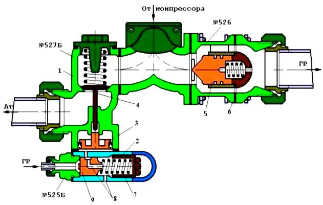 Рис. 3.14 Регулятор давления ЗРД 1-обратный клапан, 2, 12- направляющие, 3- выключающий клапан, 4, 10 - пружины, 5- винтовой стержень, 6- фильтр, 7- контргайка, 8- фасонная гайка, 9- корпус, 11-включающий клапан, 13- седло обратного клапана При работе компрессора под нагрузкой сжатый воздух из ГР проходит в среднюю часть регулятора давления, откуда через фильтр 6 поступает под выключающий клапан 3, воздействуя на его рабочую площадь, и к обратному клапану 1. В этот момент камера включающего клапана, трубопровод РУК к разгрузочным устройствам компрессора и. следовательно, полость над диафрагмой 14 (рис. 3.4.) сообщены с атмосферой через отверстие Ат. При повышении давления в ГР до 8,5 кгс/см2 выключающий клапан 3 отойдет от своего седла вверх. При этом давление воздуха распространяется на большую (срывную) площадь клапана, что вызывает четкий его подъем. Открытие выключающего клапана 3 обеспечивает проход воздуха под включающий клапан 11, который также открывается (поднимается вверх), поскольку его пружина отрегулирована на давление 7,5 кгс/см2. Включающий клапан, упираясь в верхнюю торцовую часть направляющей (гнезда) 12, разобщает правую камеру регулятора от канала РУК. При этом канал РУК перестает сообщаться с атмосферой, а правая камера регулятора продолжает сообщаться с Ат. Поднявшись вверх, включающий клапан 11 обеспечивает проход воздуха из ГР в канал РУК через ранее открывшийся выключающий клапан 3 и освобождает обратный клапан 1, который своей пружиной поднимается вверх (открывается) и тоже начинает пропускать воздух из ГР в канал РУК, и одновременно по нижнему горизонтальному каналу в привалочной части - в камеру (левую) выключающего клапана. Повышенное давление в левой камере регулятора совместно с пружиной 4 обеспечивают посадку на седло (закрытие) выключающего клапана 3. При таком положении клапана 3 воздух в канал РУК будет проходить только через открытый обратный клапан 1. Из канала РУК воздух проходит в полость над диафрагмой 14 (рис. 3.4.) разгрузочных устройств компрессора. При этом диафрагма 14 прогибается вниз и воздействует на поршень 13, который, преодолевая усилие пружин 12 и 10, перемещает вниз стержень 11 и упор 9. Последний своими пальцами отжимает от седла клапанные пластины всасывающих клапанов и удерживает их в этом (открытом) положении. Компрессор переходит в режим холостого хода, при котором ЦНД засасывают воздух из атмосферы и выталкивают его обратно через всасывающие фильтры, а ЦВД всасывает воздух, оставшийся в холодильнике, и выталкивает его обратно в холодильник. После понижения давления в ГР до 7,5 кгс/см2 пружина 10 опускает на седло включающий клапан 11, который перемещает вниз (закрывает) обратный клапан 1. При этом перекрывается доступ воздуха из ГР к разгрузочным устройствам компрессора, а камера выключающего клапана и канал РУК сообщаются с камерой включающего клапана и далее с Ат. Сжатый воздух из полости над диафрагмой разгрузочных устройств выходит в атмосферу через регулятор давления. При этом пружина 10 (рис. 3.4.) отжимает вверх упор 9, а пружина 12 - поршень 13. Клапанные пластины всасывающих клапанов своими коническими пружинами прижимаются к седлам и компрессор вновь переходит в рабочий режим. На двухсекционных тепловозах регулятор давления, управляющий работой компрессоров обеих секций, включается только на одной секции,