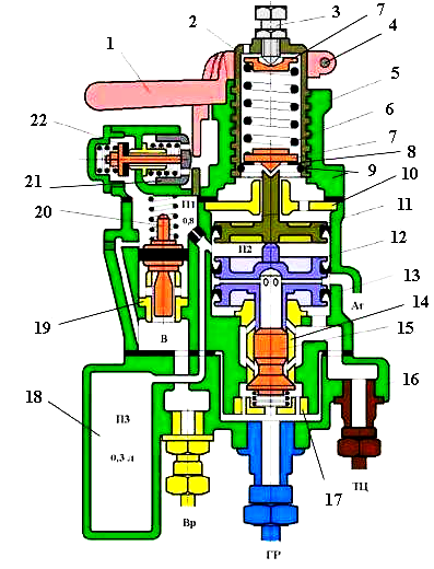 Верхняя часть состоит из корпуса 5, в котором расположен регулировочный стакан 2 с левой двухзаходной резьбой, регулировочной пружиной 6 и регулировочным винтом 3. В нижней части стакана стопорным кольцом 9 закреплена опорная шайба 8. Ручка 1 закреплена на стакане винтом 4. Регулировочная пружина зажата в центрирующих (упорных) шайбах 7. В приливе корпуса верхней части расположен буфер отпуска, состоящий из подвижной втулки 21 с атмосферными отверстиями и отпускного клапана 22, нагруженных соответствующими пружинами.