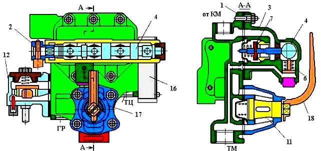 УСТРОЙСТВО БЛОКИРОВКИ ТОРМОЗОВ № 367МРабота блокировки № 367М с интерактивным управлением и анимациейУстройство блокировки тормозов применяется на двухкабинных локомотивах для принудительного затормаживания локомотива при смене кабин управления с отключением крана машиниста и крана вспомогательного тормоза в одной кабине и включения их в другой. Блокировка усл.№ 367м состоит из кронштейна 1, корпуса 3 переключателя, комбинированного крана 17 и коробки 16 с электрическим контактом. К кронштейну 1 подключены трубопроводы от ГР, ТМ и ТЦ, а также от крана машиниста и крана вспомогательного локомотивного тормоза. К кронштейну крепится корпус 12 сигнализатора расхода воздуха. В корпусе 3 переключателя расположен эксцентриковый вал 4, на который насажена съемная ручка 2, имеющая два положения; вертикально вверх - блокировка выключена, вниз - блокировка включена. Ручка 2 может быть снята с вала только при выключенном положении блокировки. В корпусе 3 находятся также клапаны 5, 7 и 8, хвостовики которых уплотнены резиновыми манжетами, и толкатель 9. Клапаны 5, 7 и 8 со стороны дисков нагружены пружинами.