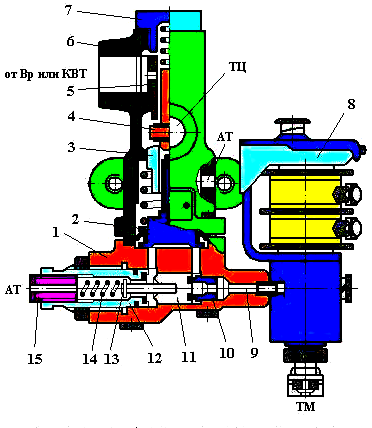 При этом понижается давление и под поршнем 2. При падении давления в ТМ приблизительно до 2,5 – 2,7 кгс/см2 переключательный клапан 11 под действием пружины 14 переместится толкателем 13 до упора вправо, перекрывая канал 9. Воздух из полости под поршнем 2 выходит в атмосферу Ат1 через осевой канал регулировочного винта 15 и поршень опускается под действием своей пружины. При этом переключательный клапан 4 своей пружиной опускается на нижнее седло 3, разобщая ТЦ от атмосферы Ат1 и сообщая их с воздухораспределителем. Происходит замещение электрического торможения пневматическим.