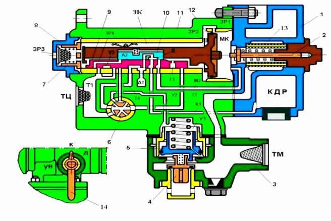 Воздухораспределитель состоит из магистральной части 11 с режимным переключателем, крышки 1 с камерой дополнительной разрядки (КДР) и ускорителя экстренного торможения 3. В корпусе крышки 1 расположен фильтр 13, буферное устройство 2 и камера дополнительной разрядки объемом 1 л. В корпусе магистральной части размещены магистральный и переключательный органы.