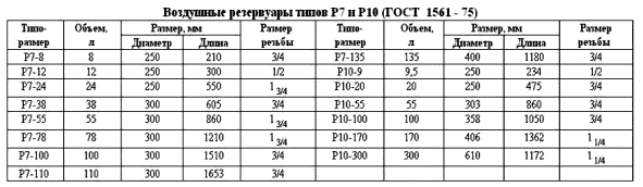 ЗР выпускаются двух типов: Р7 и Р10, рассчитанные соответственно на рабочее давление 7 кгс/см2 и 10 кгс/см2. Параметры запасных резервуаров приведены в таблице.