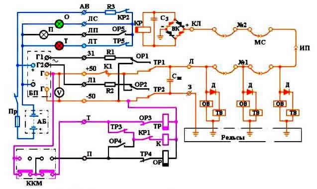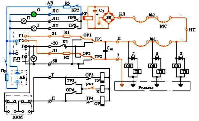 Контакты ТР1, ТР2 через замкнувшийся контакт сильноточного реле К1 обеспечивают подачу постоянного тока положительной полярности в рабочий провод №1, а отрицательной полярности - на корпус (в рельсы):