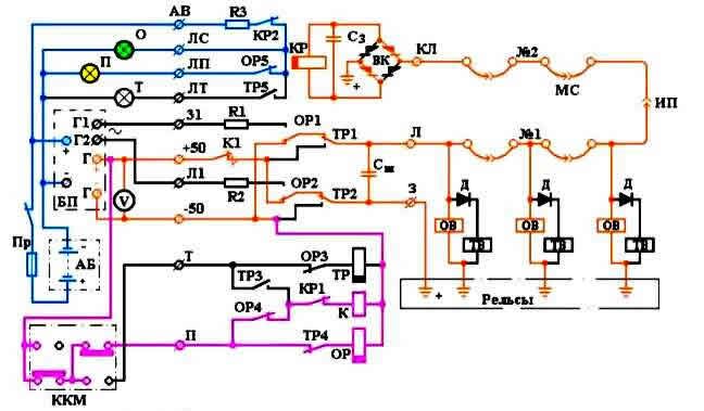- выход Г1 БП, резистор R1, контакты ОР1, ТР1, рабочий провод №1, катушки ОВ и ТВ вентилей ЭВР локомотива и вагонов, рельсы, контакты ТР2, ОР2, резистор R2, Г2 БП.