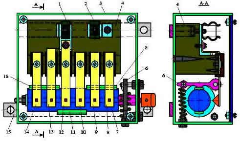 Тормозной переключатель имеет корпус 3, в котором расположен барабан 7 с тремя медными сегментами 5, 11, 16 и фиксатором 6. Корпус имеет планки 15 для крепления его к стенке кабины. В корпусе помещена деревянная колодка 4, на которой смонтированы две контактные губки 1 и 2 для установки предохранителя и шесть пружинных контактных пальцев 8, 9, 10, 12, 13, 14. Пальцы опираются свободными концами на барабан 7 обеспечивая контакт с его медными сегментами. К контактным пальцам и губке 2 подключаются электрические провода. Плюсовой провод №15 подключается к губке 2 и через установленный в губках предохранитель - к контактному пальцу 12. К пальцам 13 и 14 подключены соответственно минусовой (№ 30) и обратный (№ 43) провода. К пальцу 10 подключается провод, идущий к контроллеру крана машиниста и сигнальной лампе, к пальцу 9 - отпускной провод (№ 49), к пальцу 8 - провод от катушки блок-реле. В положении I переключатель замыкает пальцы 10 и 12, в положении II все пальцы разомкнуты, а в положении III замкнуты пальцы 13, 14, 8, 9.