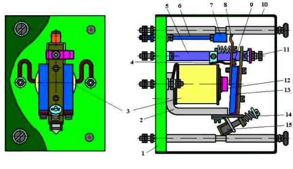 На изоляционной панели 1 блок-реле смонтированы катушка 3, магнитная система, состоящая из ярма 2, сердечника 12 и якоря 13, и контактные шпильки 5 и 6, с которыми связаны подвижной 8 и неподвижный 7 контакты. Зазор между контактами регулируется винтом 11, а также гайкой 15, изменяющей усилие пружины 14. Гибкий шунт 4, соединяющий подвижной контакт 8 с контактной шпилькой 5, закреплен центрирующим винтом 9. Все элементы блок-реле закрыты металлическим кожухом 10.