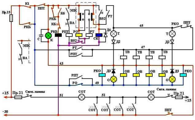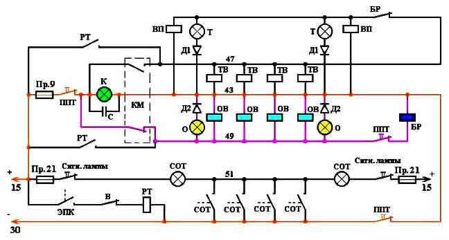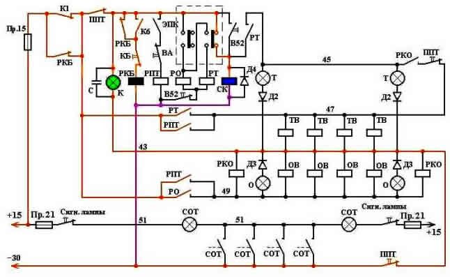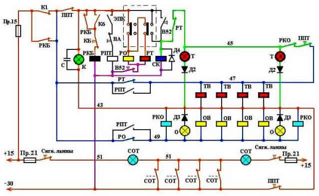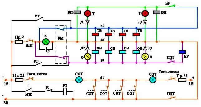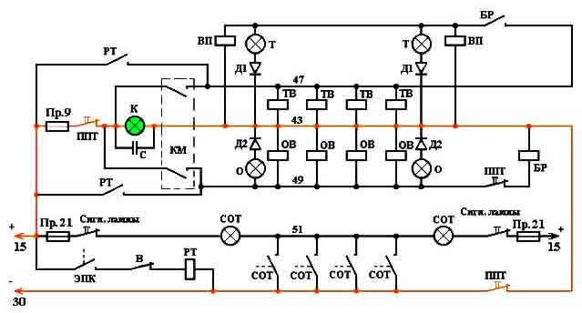 провод (+)15, Пр.15, контакты РКБ, контакты РТ, провод 47; контакты ППТ (хв.), контакты РКО, провод 45, лампы «Т», провод 43, контакты ППТ (хв.); провод (-)30.