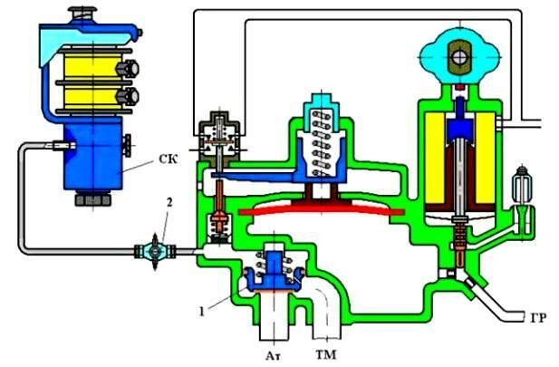 При экстренном торможении происходит разрядка ТМ через кран машиниста. В этом случае ВР № 292-001 хотя и придут в действие, но торможения не произведут, так как наполнение ТЦ будет осуществляться ЭВР № 305-001 за счет более высокого их быстродействия.