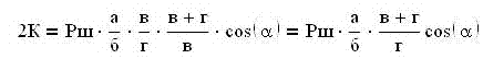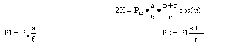 В данном случае сила Рш поршня, действующая по направлению штока, поворачивает горизонтальный рычаг первого рода в точке 2 и перемещает тягу 3-4 с выигрышем силы пропорционально отношению плеч этого рычага а/б. Полученная на тяге сила Р1 поворачивает вертикальный рычаг, который в данный момент работает как рычаг второго рода, в точке 5 и притягивает ближний к тормозному цилиндру триангель с новым изменением силы, пропорциональным отношению плеч (г+в)/в. Эта сила Р2 образует угол альфа с направлением радиуса, проходящего через центр колеса и середину колодки, т.е. с направлением нормального давления колодок. Чтобы определить величину силы нажатия на тормозные колодки 2К нужно силу Р2 умножить на cos альфа. На основании сказанного можно написать:
