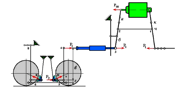 Эта формула позволяет определить сипу нажатия на первую пару тормозных колодок, после прижатия которых рычаг 4-5 будет поворачиваться в точке 7. Затяжка 5-6 перемещается влево и поворачивает подвеску 6-8 вокруг неподвижной точки 8 до прижатия второй пары колодок к колесам. Как правило, тормозные рычажные передачи