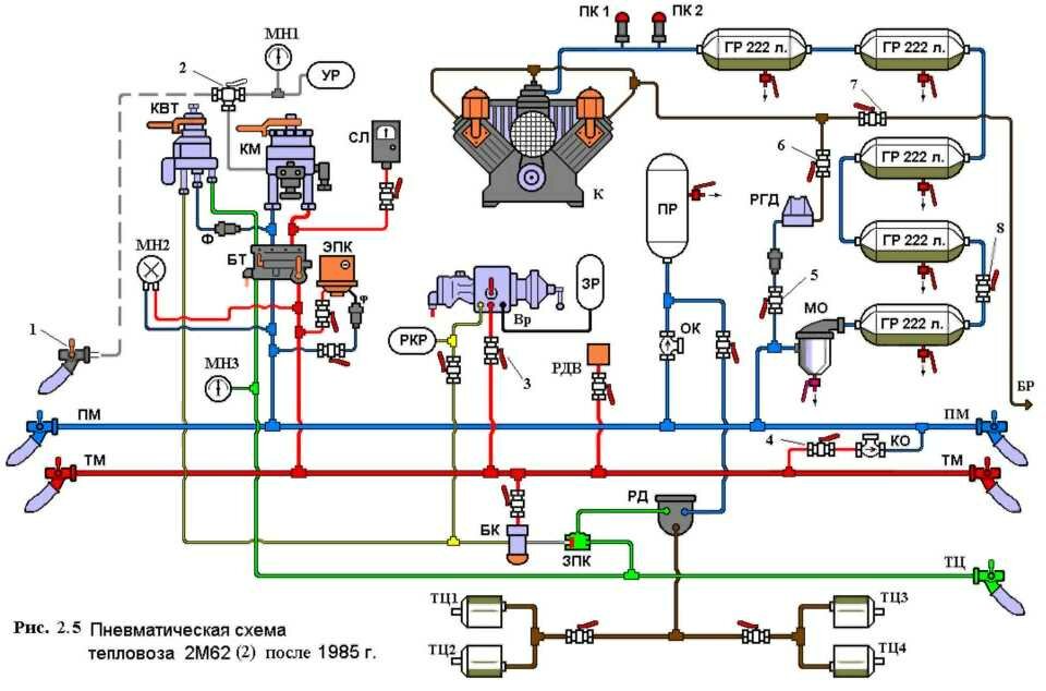 Схема тормозного оборудования тепловоза 2М62 Изображение до 1985 г. Изображение после 1985 г. Описание