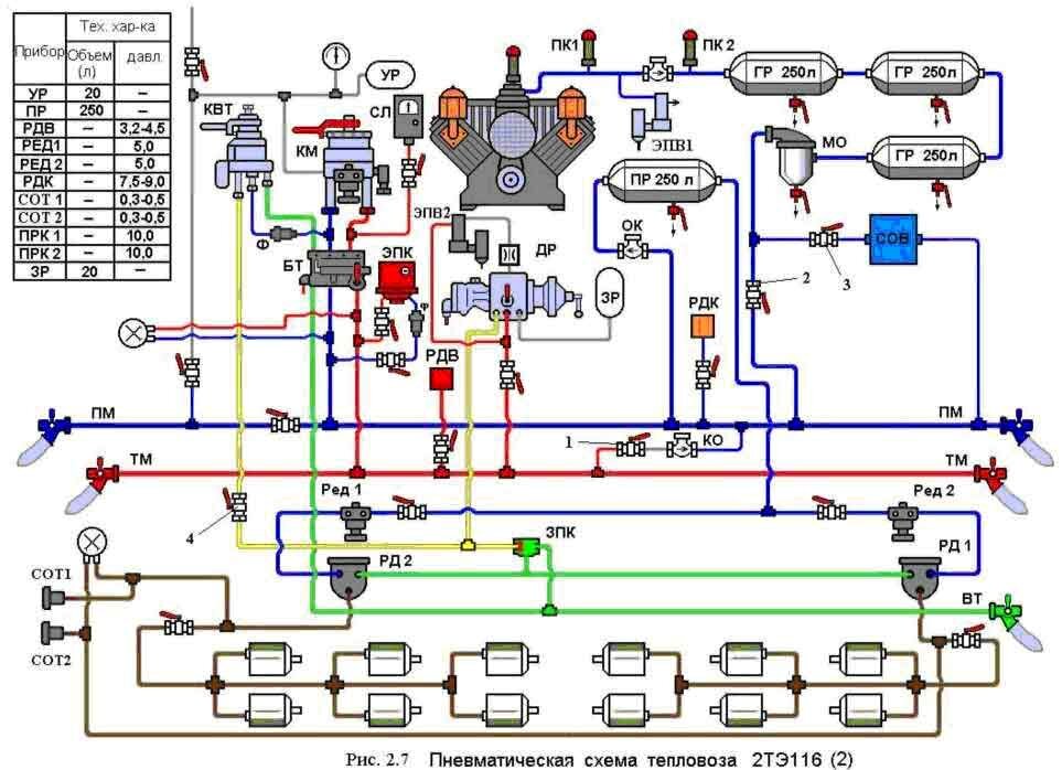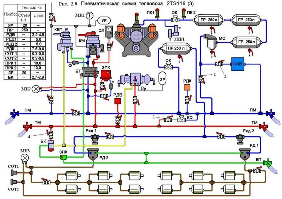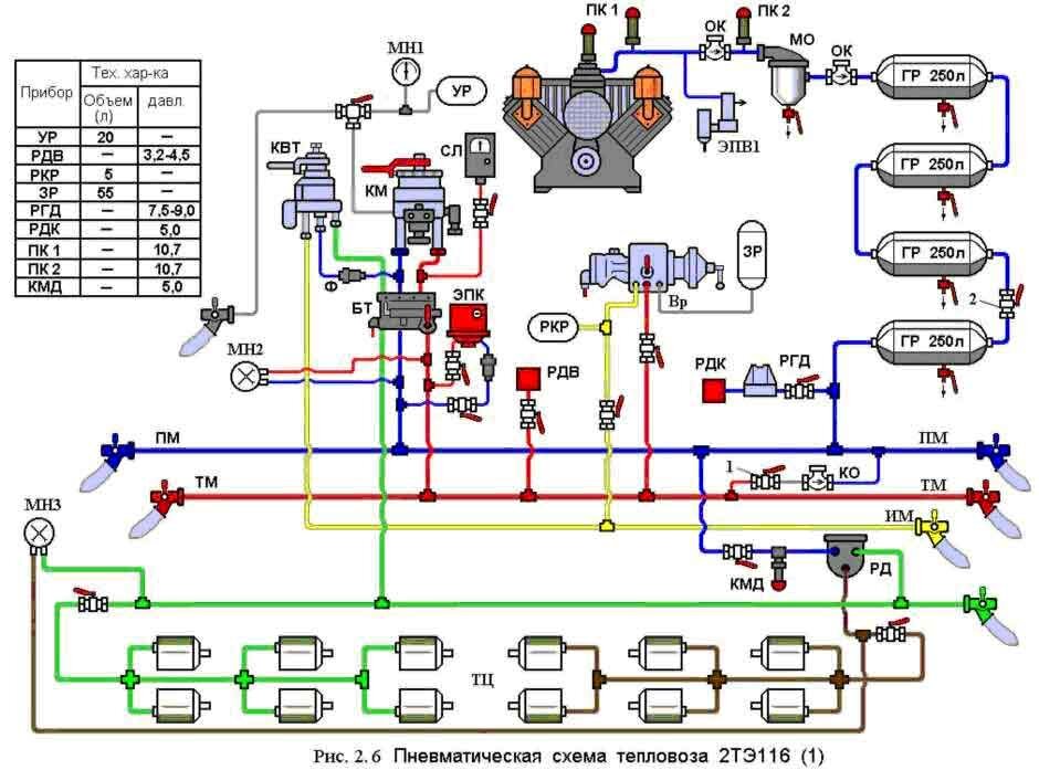 Схема тормозного оборудования тепловоза 2ТЭ116 Описание Изображение схемы тепловоза