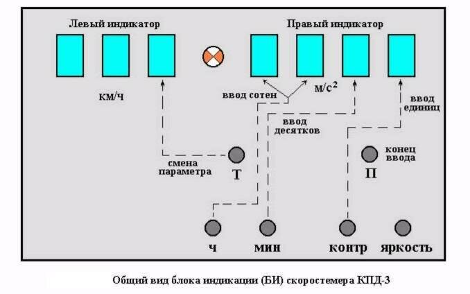Значения вводимых параметров индицируются на правом индикаторе БП, при этом кнопка «КОНТР» меняет по кругу единицы, кнопка «МИН» - десятки. «Ч» - сотни и тысячи. Ввод параметров заканчивается нажатием кнопки «П», а результат ввода записывается в МПЭ. При этом скоростемер переходит в режим контроля параметров движения.