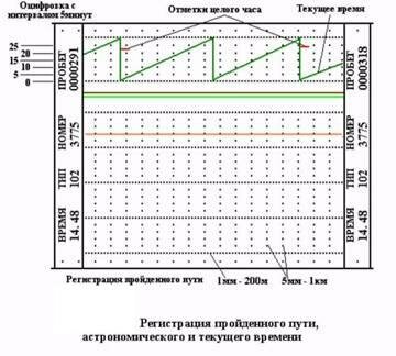 Пройденный путь регистрируется каждый 1км (масштаб записи 5 мм - 1 км), а также через каждые 200 м.