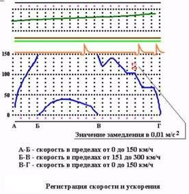 Запись производится печатью цифр на протяжении последующих 800 м. (Пример записи скорости и ускорения показан на рисунке)